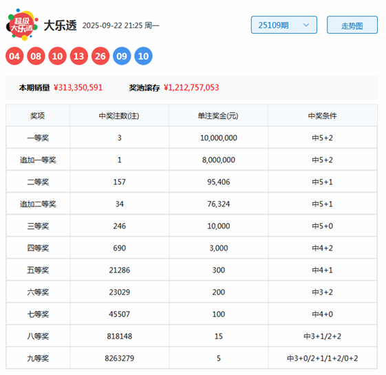 大乐透第2025109期开出奖号为04、08、10、13、26+09 10。其中前区奇偶比为1:4,三区比为3:1:1,大小比为1:4,后区为全大组合。