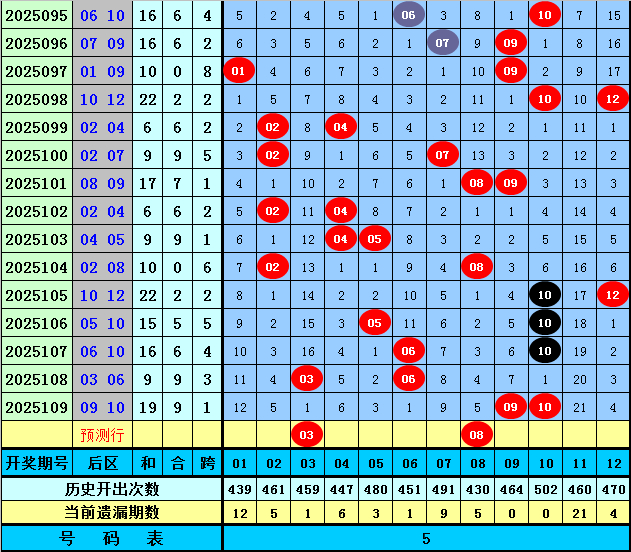 前区二号球分析:上期开出奖号08,该位最近10期出现范围在06-28之间,中点为17,其中小于中点的奖号出现8次,大于中点的奖号出现2次,中点17没有出现,本期该位继续关注中位号码以下的号码,考虑号码12。