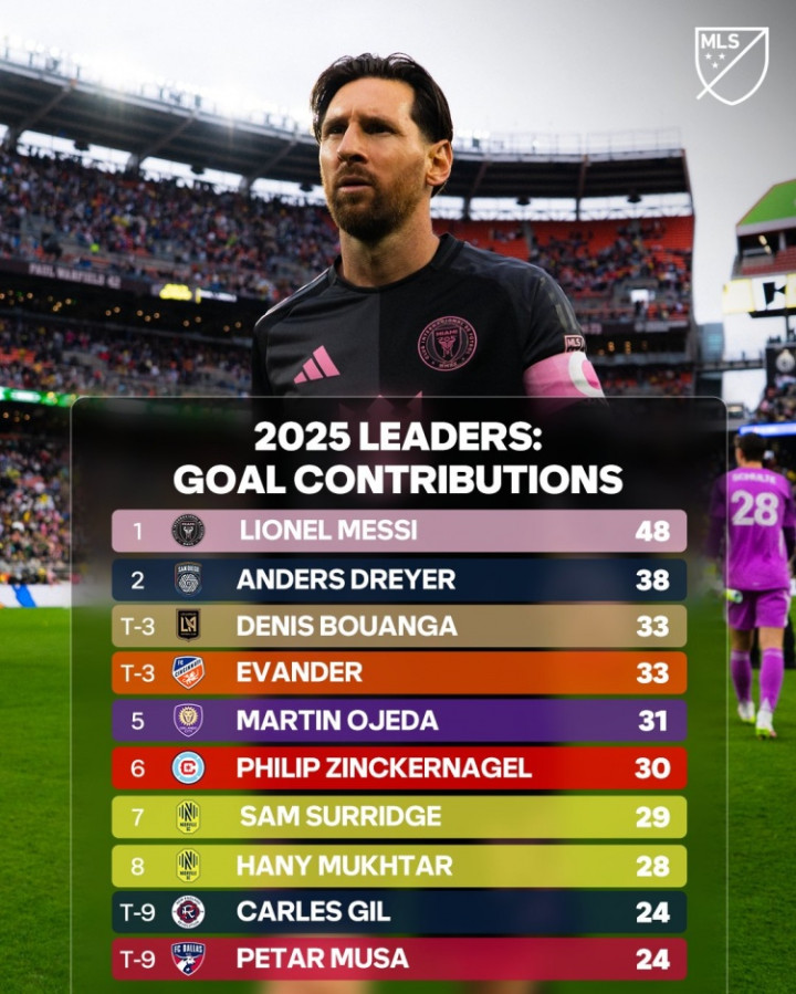 直播吧10月22日讯据美职联官方统计,梅西本赛季参与48粒进球,所有球员中最多。