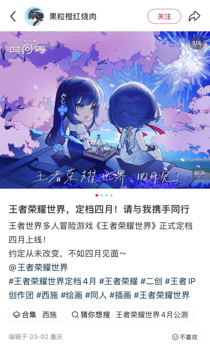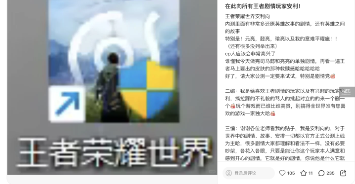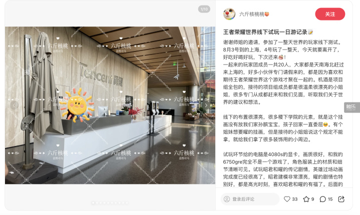 在核桃的社交媒体主页,她记录了很长一段时间对《王者荣耀世界》的关注,过程中,心情也随之起伏——最开始是记录测试后的游玩感受,“封测这个完成度,感觉很不错了”;后面是对爆料的收集和吐槽,“发了移动端实机PV”“拿到版号了”;期间夹杂着对每次测试变化的讨论,“老玩家说一下,伽罗和铠的建模改动非常大”“谁懂曜的试卷被做成载具的救赎感”;最近这段时间,她用官方的宣传素材剪了一则关于《王者荣耀世界》里“东方色彩”的卡点视频,“感觉真的很美,想宣传一下”。