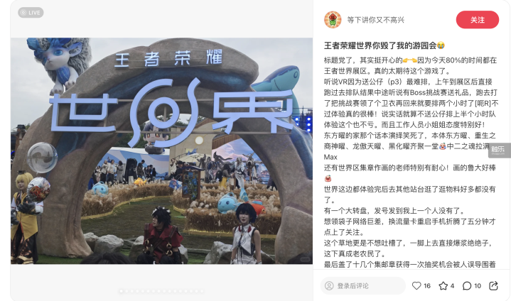 我是在去年10月份产生这种模糊的感觉的。当时是“王者荣耀”的十周年嘉年华,我在《王者荣耀世界》的试玩展区见到了很多玩家,其中只为了试玩《王者荣耀世界》而来的玩家绝对不在少数,有玩家告诉我,他在嘉年华上“80%的时间都在世界的展区”;组队参与Boss挑战赛的排队处,大部分玩家都曾参与过内测,对这款游戏“有很多很多话想说”。