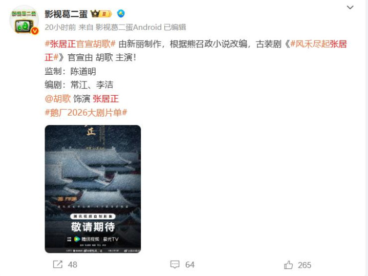 果不其然,和我之前得到的消息差不多,就是40集历史大剧《风禾尽起张居正》终于官宣了,男一号就是胡歌。