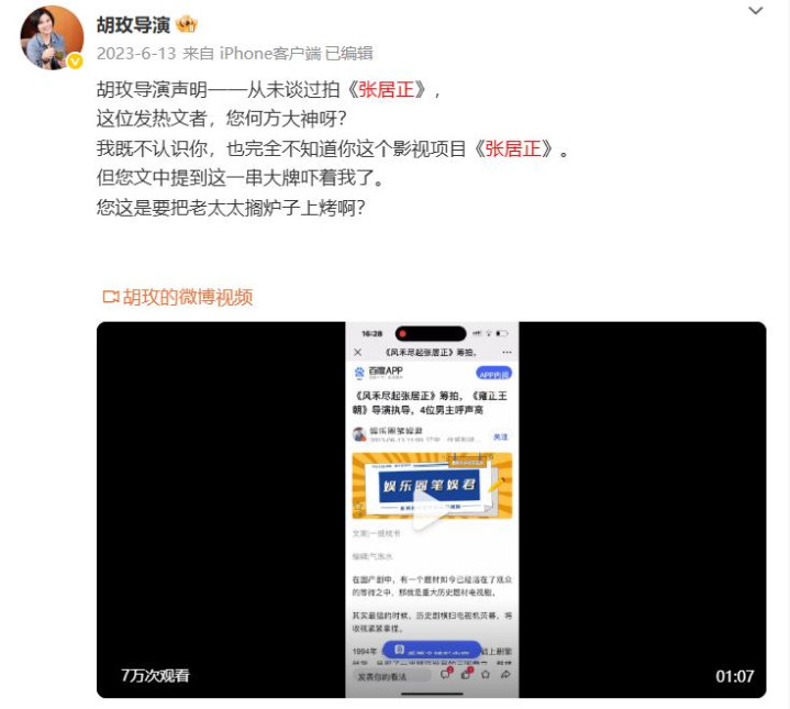 “我既不认识你,也完全不知道你这个影视项目《张居正》。但您文中提到这一串大牌吓着我了。您这是要把老太太搁炉子上烤啊?”