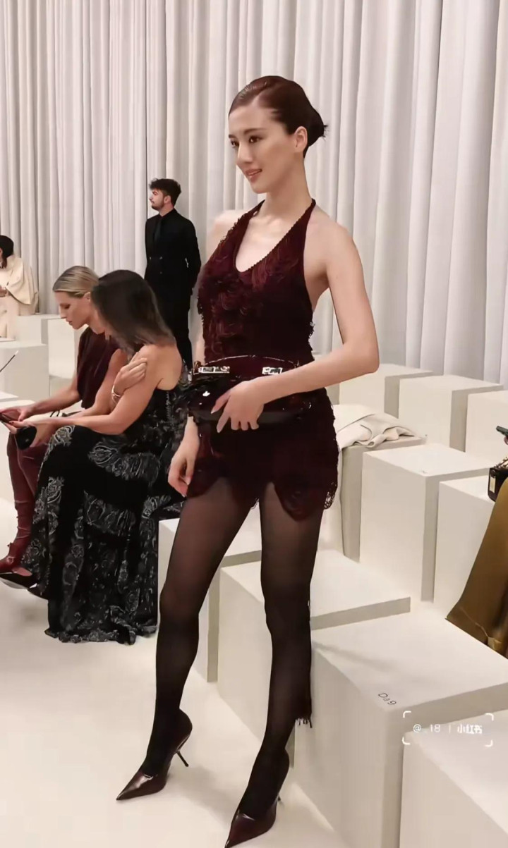 和秀场图相比,吴千语输在身高上,这件夸张的外套太压身高了,秀场模特是把扣子解开穿的,整身造型更有呼吸感。吴千语则穿的板板正正,缺了一点时髦气质。