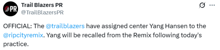 北京时间11月5日,开拓者官方宣布:球队已将杨瀚森下放到G联赛(发展联盟)球队撕裂之城混音队。在今天训练结束后,杨瀚森将从混音队被召回。 换言之,杨瀚森的第二次下放是当天往返,而此前的首次下放,他在混音训练了两天。