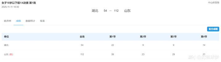 北京时间11月11日,全运会女篮U18青年组小组赛,山东队112-54大胜湖北队拿到四连胜,山东队拿到这一波四连胜后已经提前锁定了八强名额。