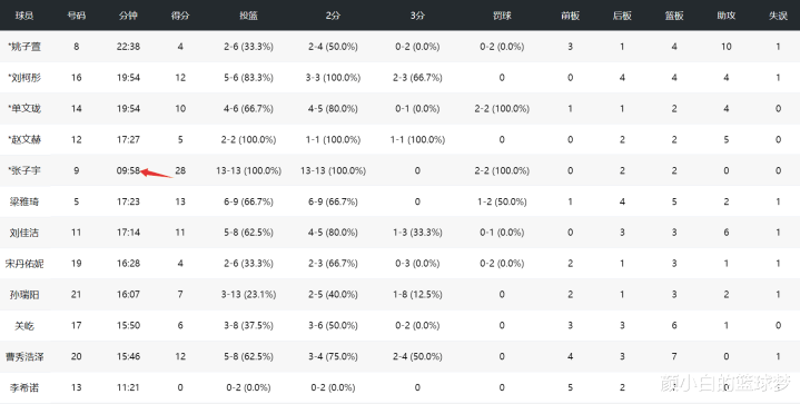 张子宇此役仅仅登场9分58秒,13中13,罚球2中2,拿到28分2篮板,命中率100%,没错10分钟拿28分,平均一分钟拿2.8分,如果张子宇打30分钟不是要拿84分!当然,这是理论上,毕竟张子宇的体能也不允许她打30分钟。